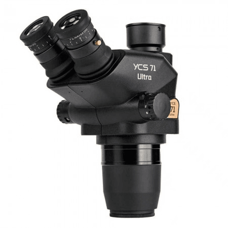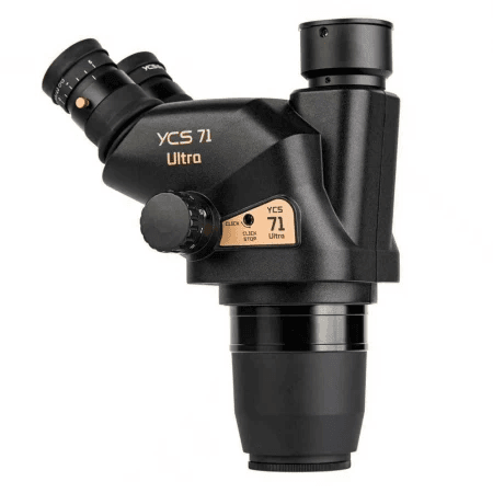 El Microscopio Trinocular 71 Ultra YCS ofrece un aumento estándar de 6.7× a 45× con zoom continuo (0.67×-4.5×), ampliable hasta 225× con lentes auxiliares, e incorpora oculares de campo amplio PL10×/22-23 mm con ajuste dióptrico ±5 y distancia interpupilar ajustable entre 52 y 76 mm. Su cabezal trinocular, inclinado 45° y giratorio 360°, permite dividir la luz en una proporción aproximada de 20% para los oculares y 80% para cámara.