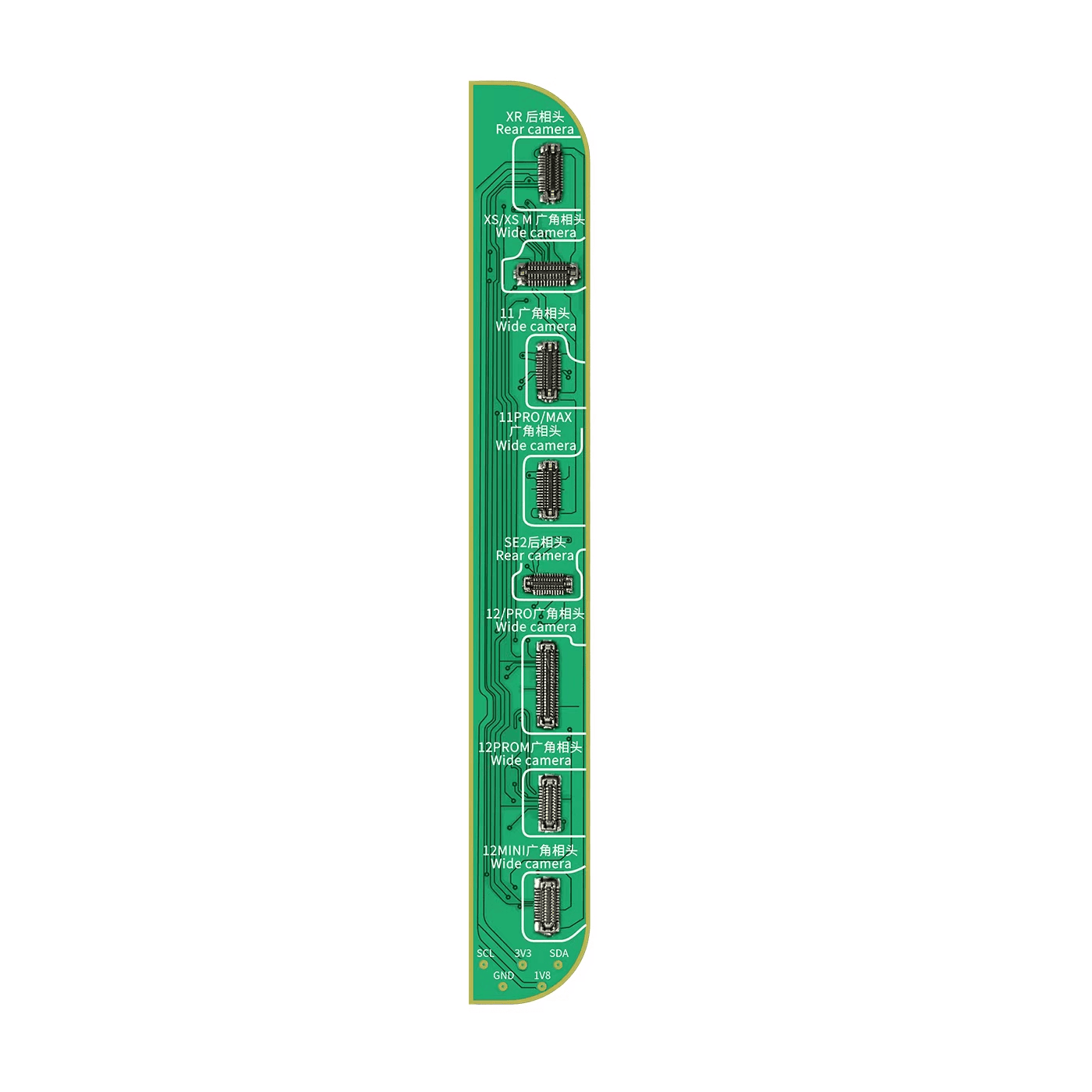 La Placa de Cámara Gran Angular para iPhone XR-12PM JCID es una herramienta especializada diseñada para técnicos en reparación de dispositivos Apple. Su función principal es facilitar el diagnóstico, la calibración y la reparación de módulos de cámara gran angular en una amplia gama de modelos de iPhone, que abarca desde el iPhone XR hasta el iPhone 12 Pro Max. Gracias a su diseño preciso y materiales de alta calidad, esta placa garantiza conexiones estables y seguras, esenciales para un trabajo de servicio técnico profesional.