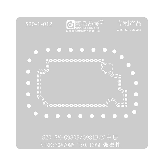 El Stencil Interposer para Samsung S20 G980 de 0.12mm Amaoe es una herramienta de alta precisión diseñada específicamente para facilitar el proceso de reballing en los modelos de Samsung S20, incluyendo las variantes SM-G980F, SM-G981B y SM-G981N. Este stencil es ampliamente utilizado en servicios técnicos especializados, proporcionando una solución confiable para restaurar la funcionalidad de la interposer de estos dispositivos y asegurando un sellado preciso y duradero.